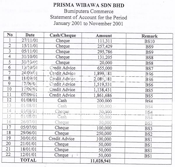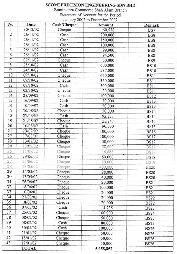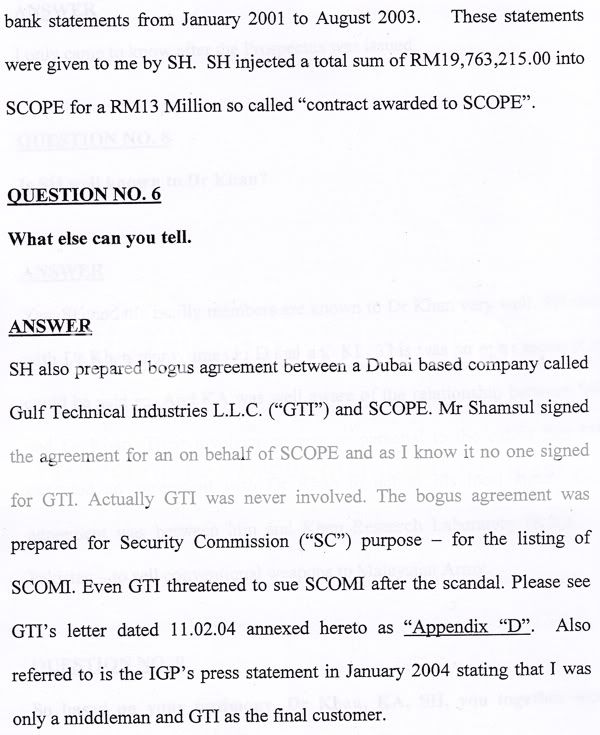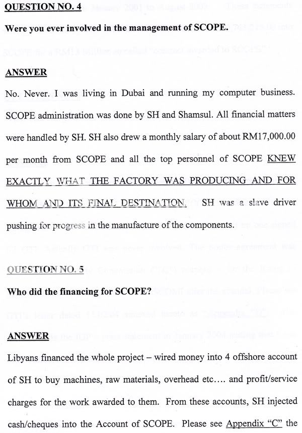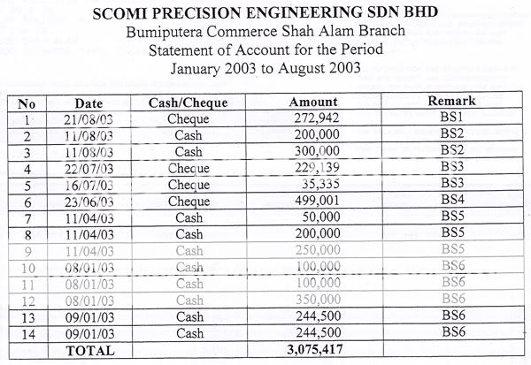 According to the statement of accounts supported by bank statements that BSA Tahir showed the Home Ministry, almost RM20 million was transferred from Libya to Malaysia to finance the production of the nuclear centrifuge. Tahir also revealed that SCOMI submitted a bogus agreement to the Security Commission for purposes of listing the company on the Malaysian stock exchange.