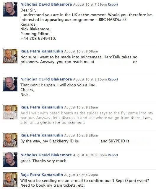 Guys/gals, please listen. Raja Petra was NEVER invited nor was he ever scheduled to be interviewed by the BBC. It was all a LIE. None of the 5 current producers of BBC Hardtalk ever invited Petra before to be on the programme. Yes, Anwar's Pakistani boys did managed to persuade The Guardian to do a piece on Petra about a couple of weeks back but there has not been very much success with the other media (printed or electronic) in UK.It always amazes me the amount of people that are so willingly allowed themselves be taken for a ride just because of their blind hatred towards the ruling Government.
